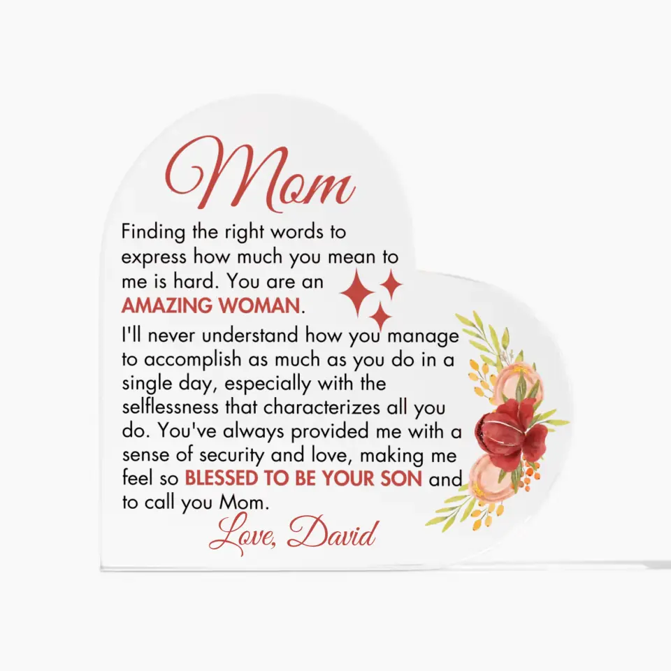 Don't let another day pass without telling your mom how incredible she is. Purchase the "Eternal Love for Mom" Heart-Shaped Acrylic Plaque today, exclusively at Gifts4allofus.com, and make her feel as AMAZING and BLESSED as she truly is! 💕