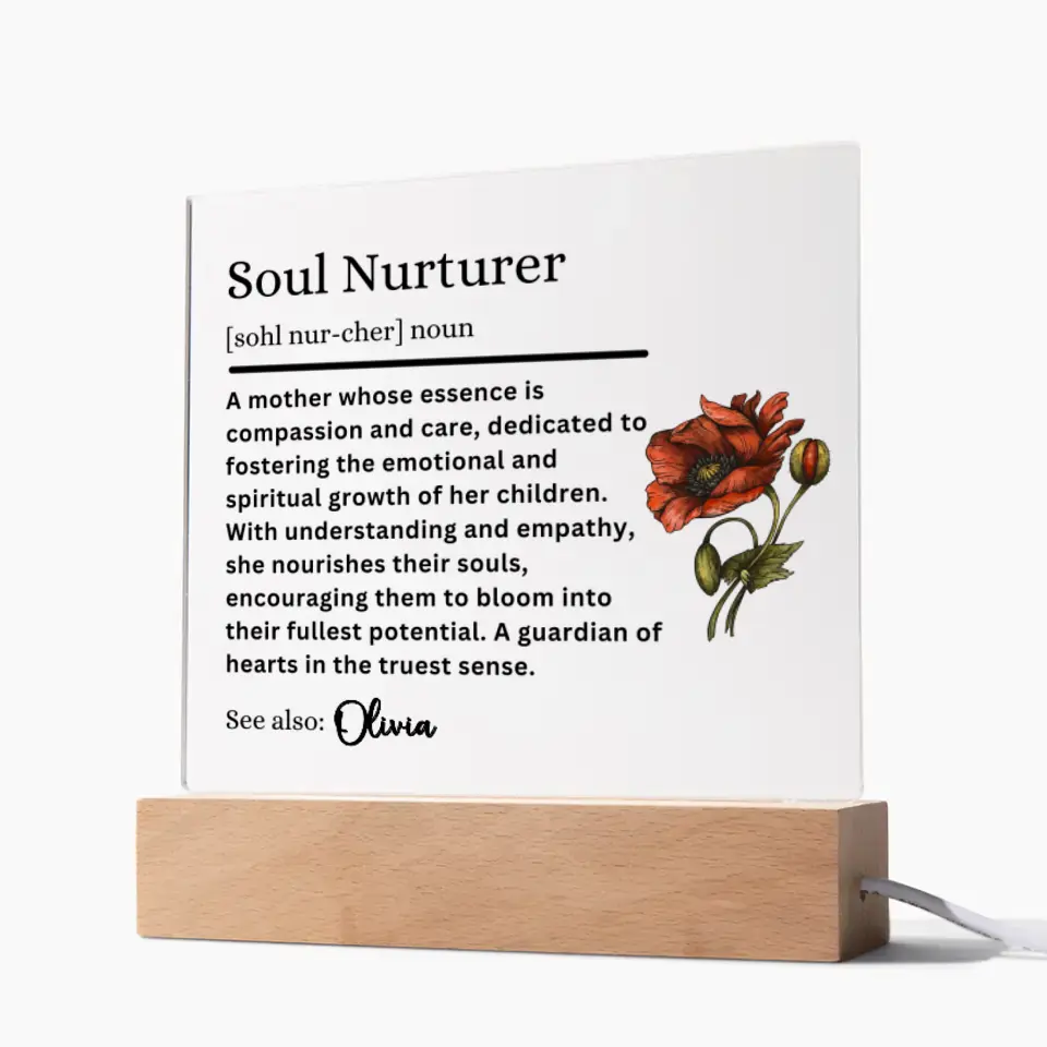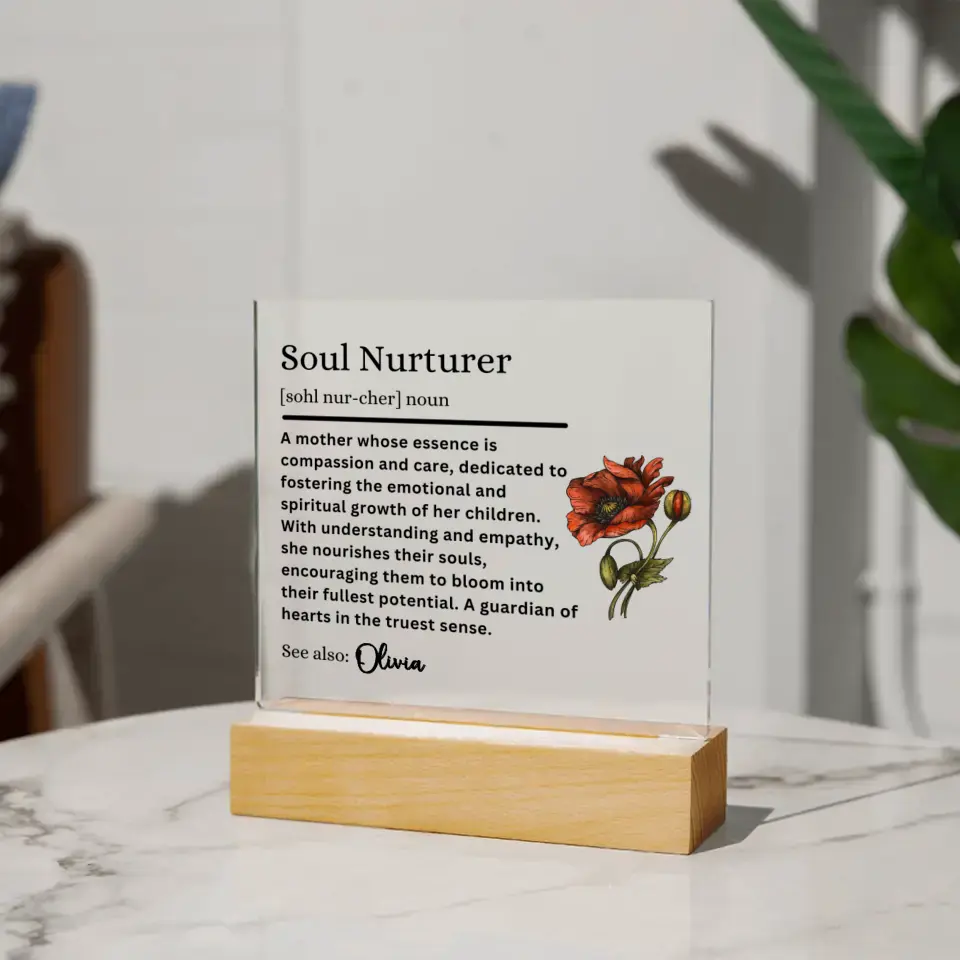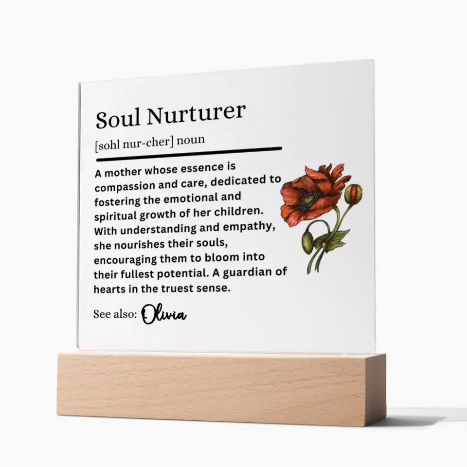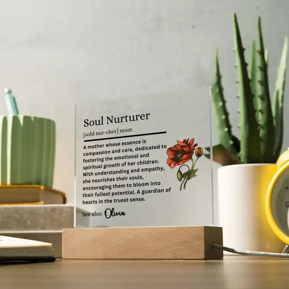 Capture the essence of what she means to you with our exquisite acrylic plaques, designed to celebrate the enduring roles of motherhood. Whether she's your Guiding Star, Soul Nurturer, Guardian of Dreams, Wisdom Whisperer, or Grace Giver, these plaques are a modern tribute to her influence and love. Personalize it with her name and the definition that best describes her unique bond with you. It's not just a gift; it's a timeless piece of art that says, 'Your love has shaped me.