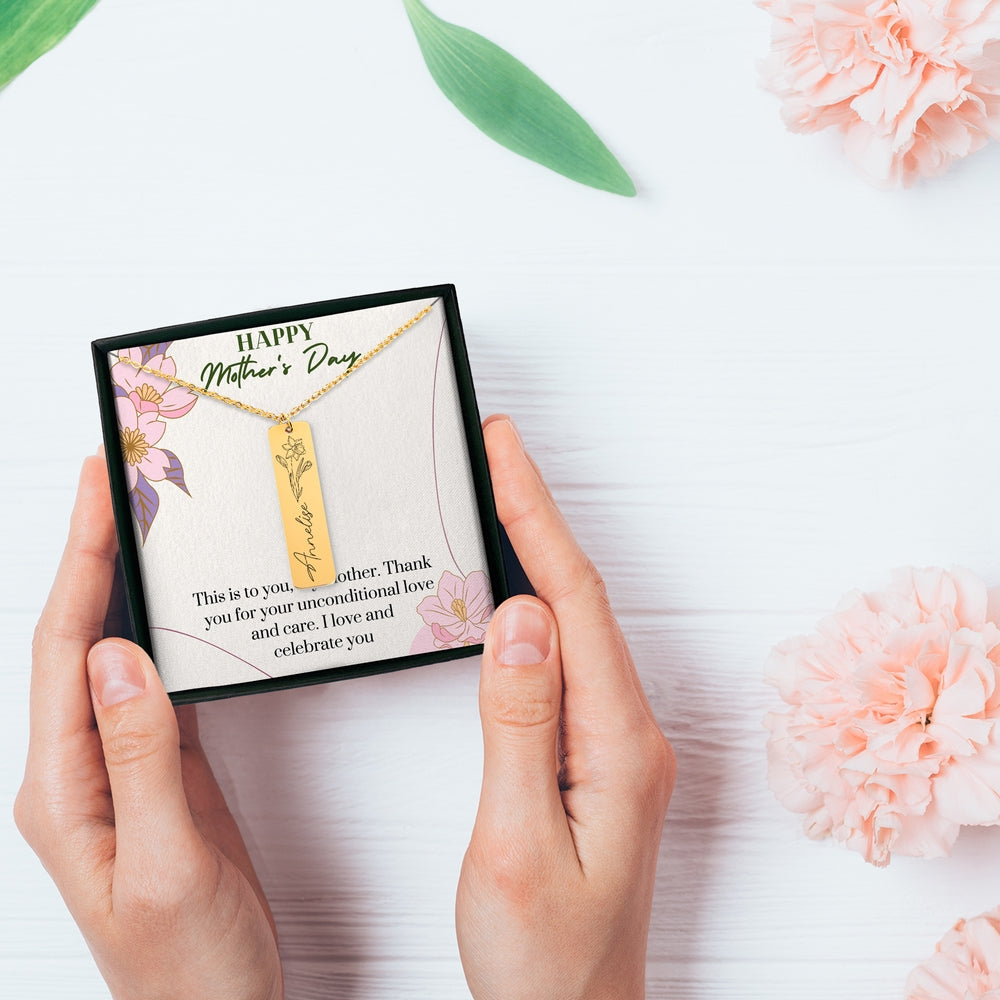 More than just a necklace… Create a truly unique gift by personalizing this necklace with a name and one of our 12 birth flowers corresponding to a birth month. Optionally, you can choose to give the necklace an even more personal touch by adding a custom message or coordinates on the back.