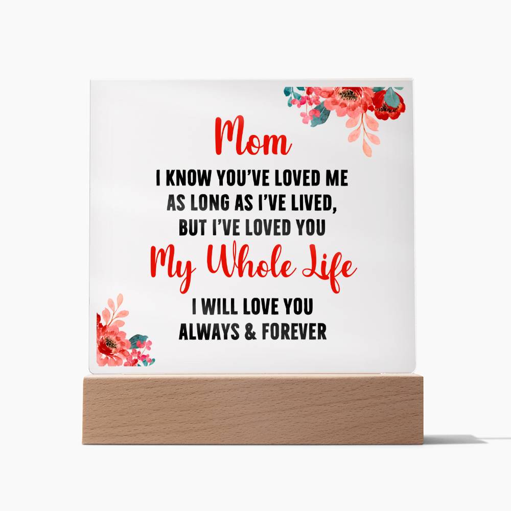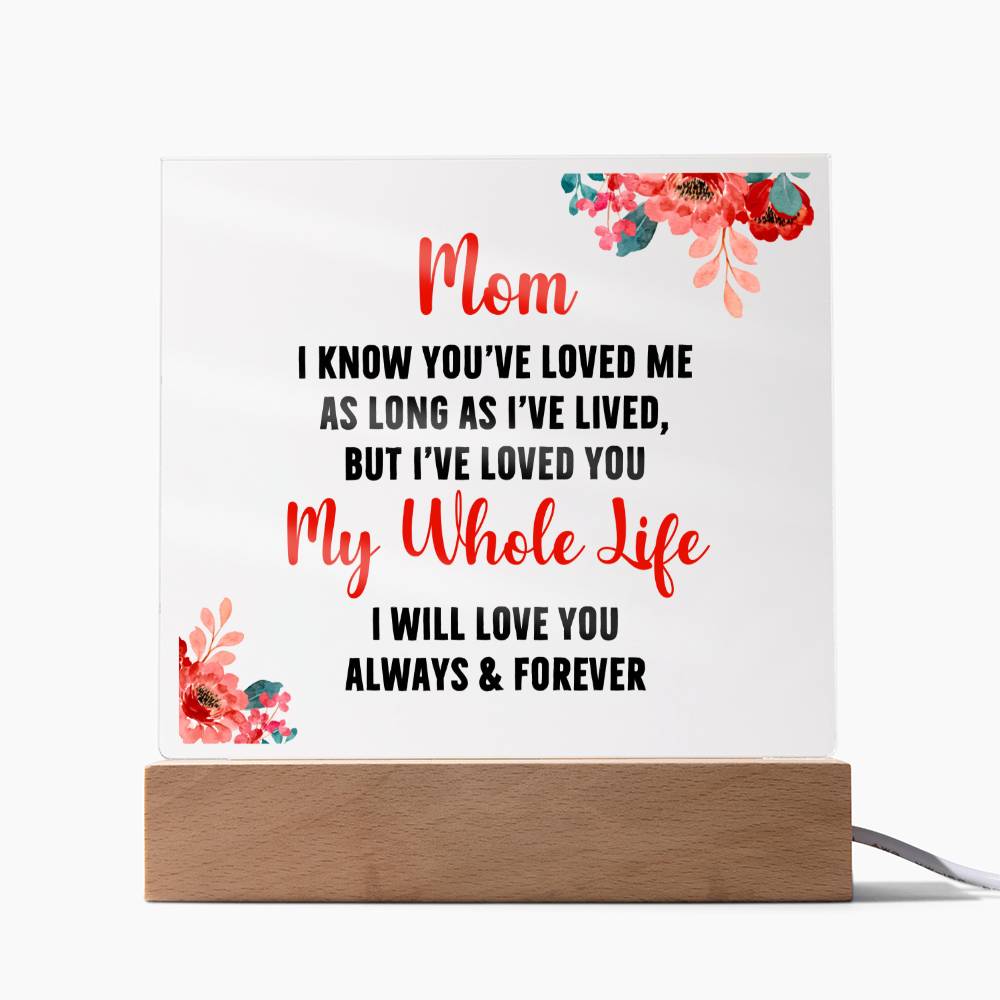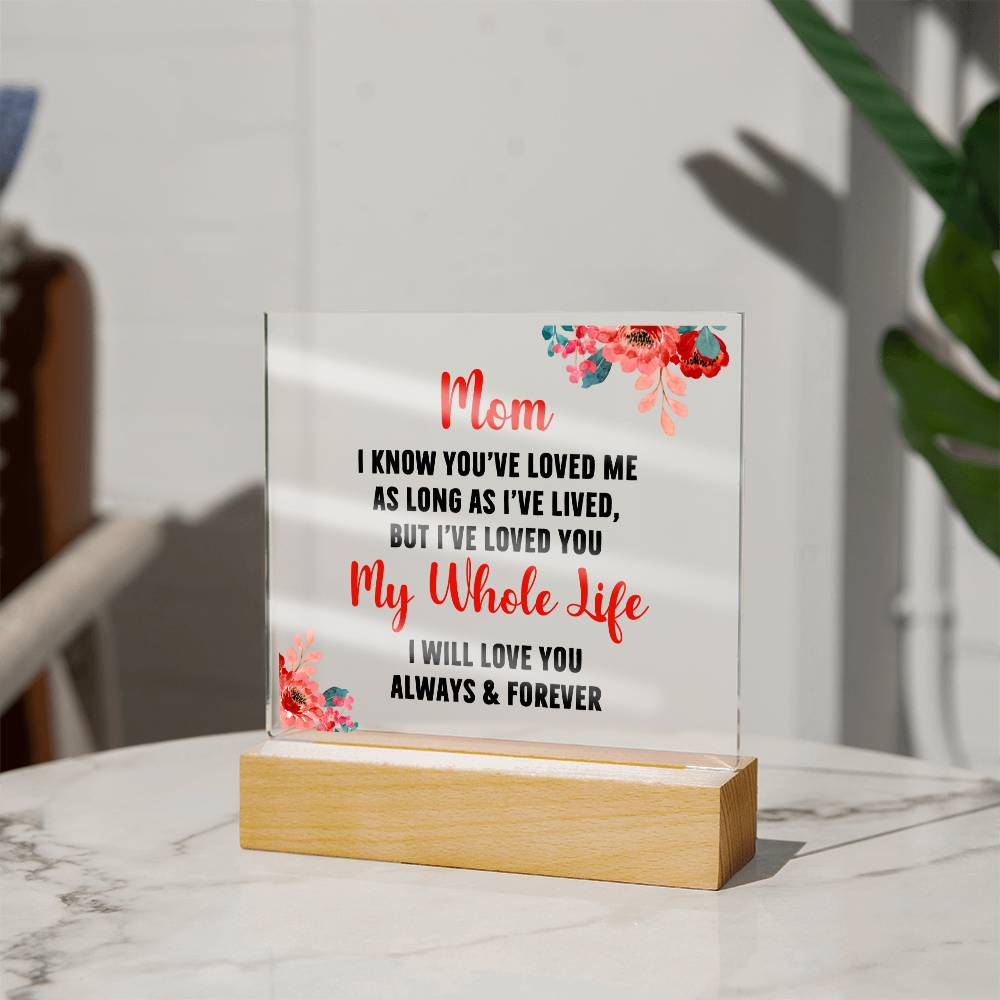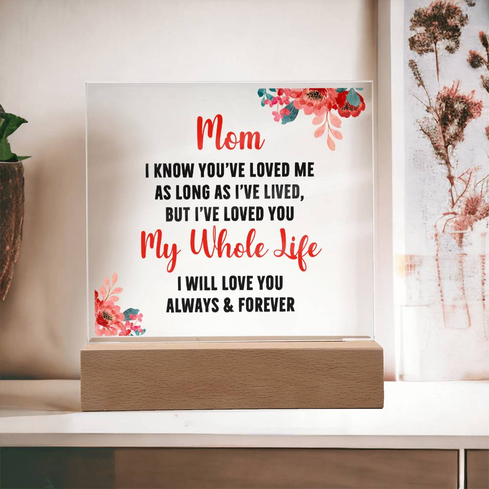 🌟✨ Discover the Perfect Way to Say "I Love You Mom" with the Exclusive "Eternal Love Illuminated Plaque" ✨🌟 Only at Gifts4allofus.com, this stunning Square Acrylic Plaque with Optional LED Base is a one-of-a-kind gem that captures the timeless bond between mother and child. 💖 💌 Message of Unending Love 💌 Engraved with the tender sentiment, "Mom, I know you've loved me as long as I've lived, but I've loved you my whole life. I will love you always and forever," this plaque is more than a gift; it's a heartwarming declaration of eternal love and gratitude. 🌹 🔍 Product Specifications 🔍 Premium Acrylic: Crystal-clear for a luxurious look. Dimensions: Perfectly sized at 6.5" height x 5.9" width with an acrylic depth of 0.1". Wooden Base: Elegant and sturdy, measuring 1.2" height x 5.9" width x 1.8" depth. Optional LED Base: Add a mesmerizing touch with colorful lights that make your love shine bright. 💡✨ Sharp, Detailed Printing: Ensuring every word conveys your heartfelt emotions.