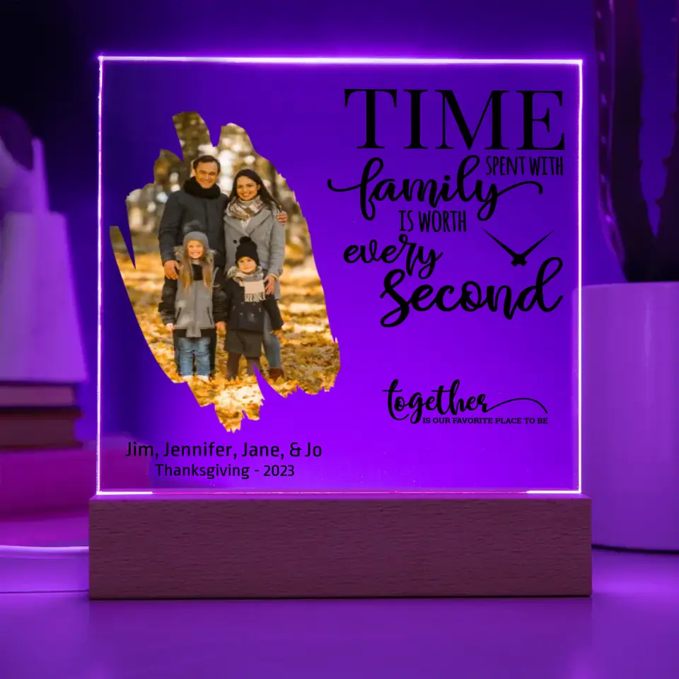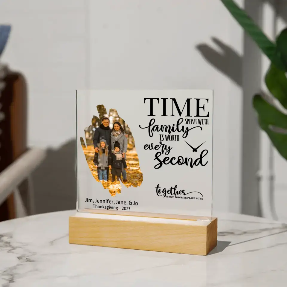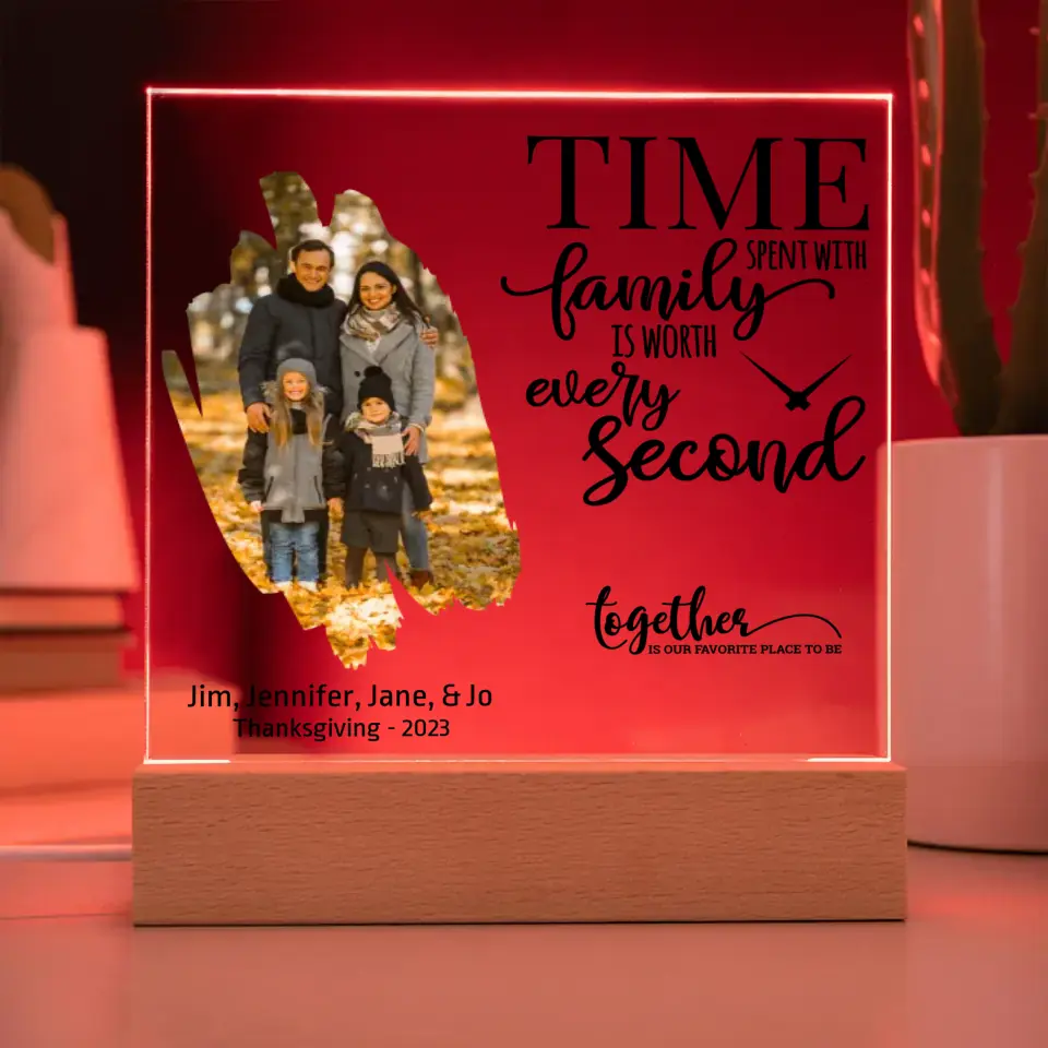 Now you can, with our custom-made acrylic masterpiece! Your cherished family photo encased in crystal-clear acrylic, illuminated with the loving words, 'Time spent with family is worth every second. Together is our favorite place to be.'