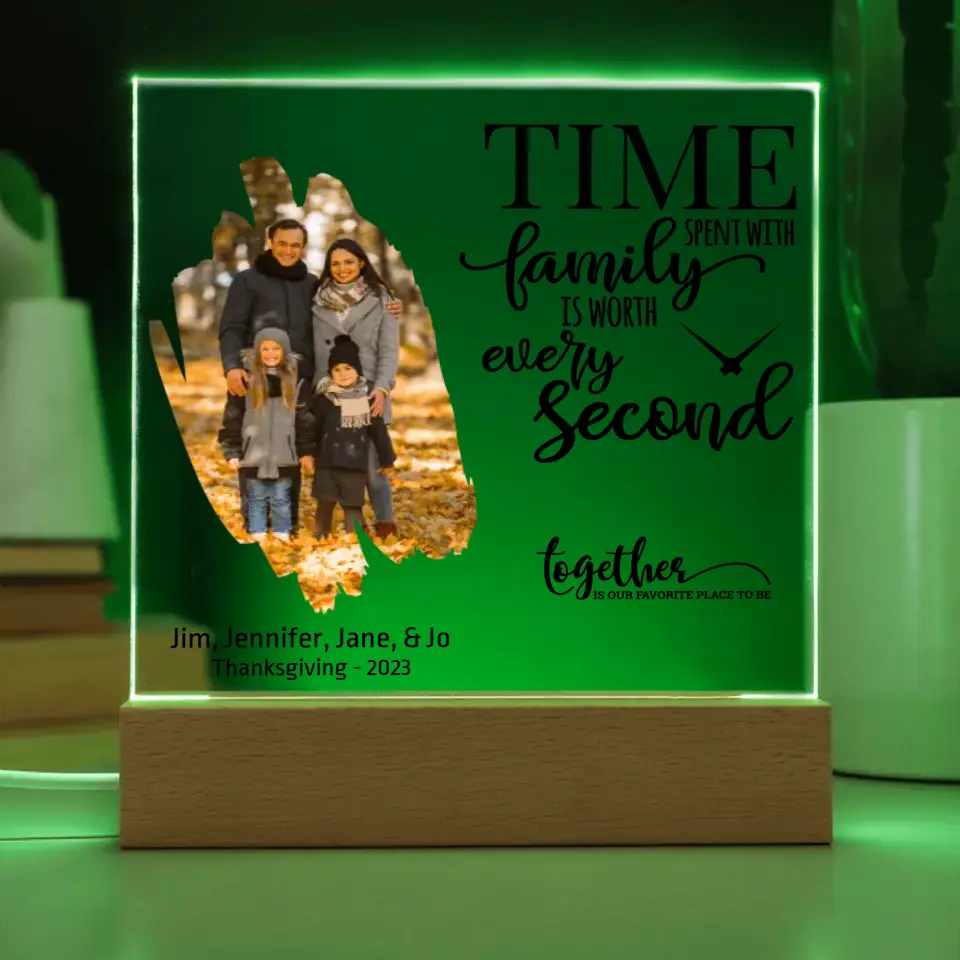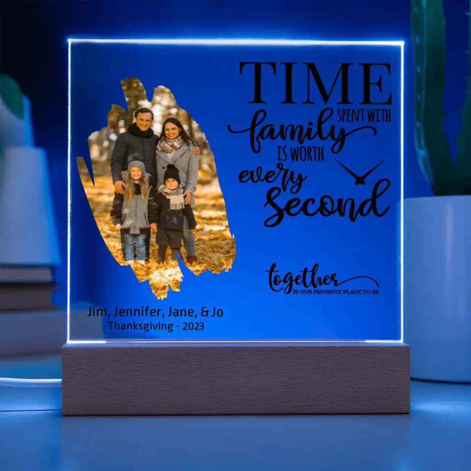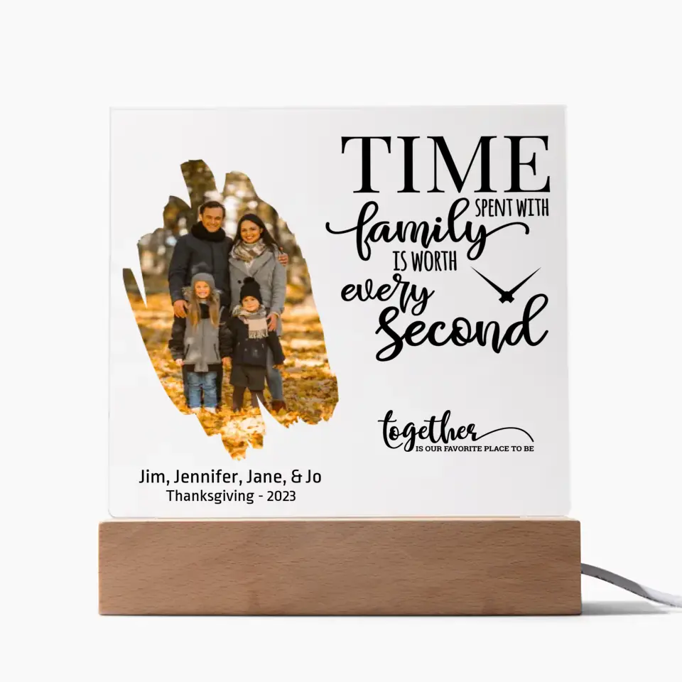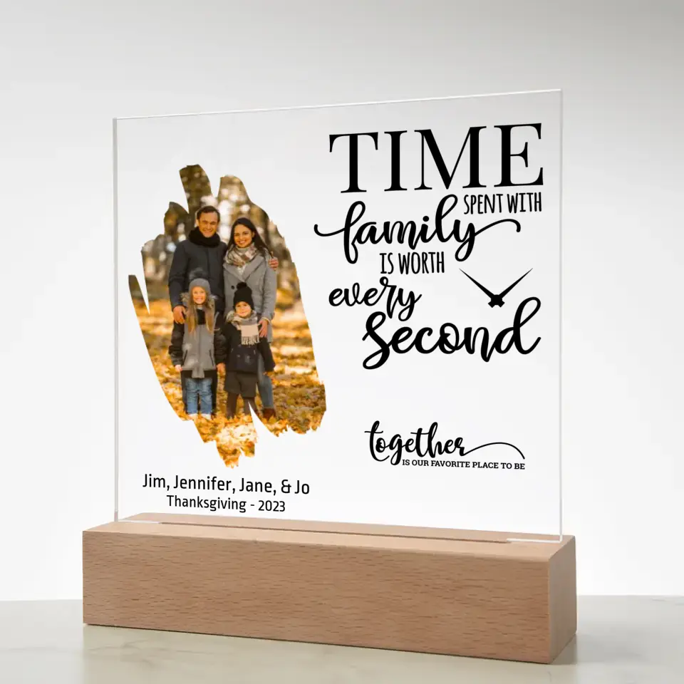 Now you can, with our custom-made acrylic masterpiece! Your cherished family photo encased in crystal-clear acrylic, illuminated with the loving words, 'Time spent with family is worth every second. Together is our favorite place to be.'