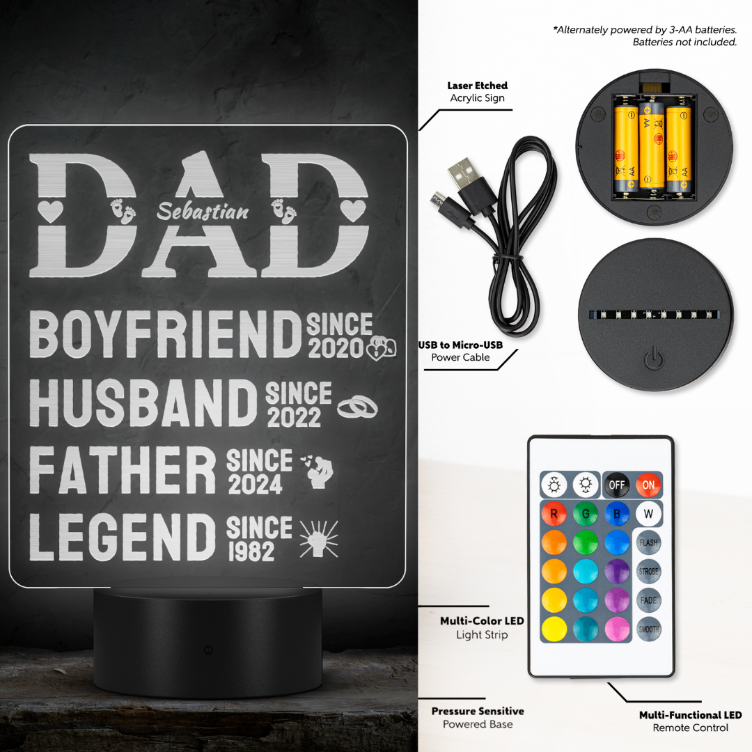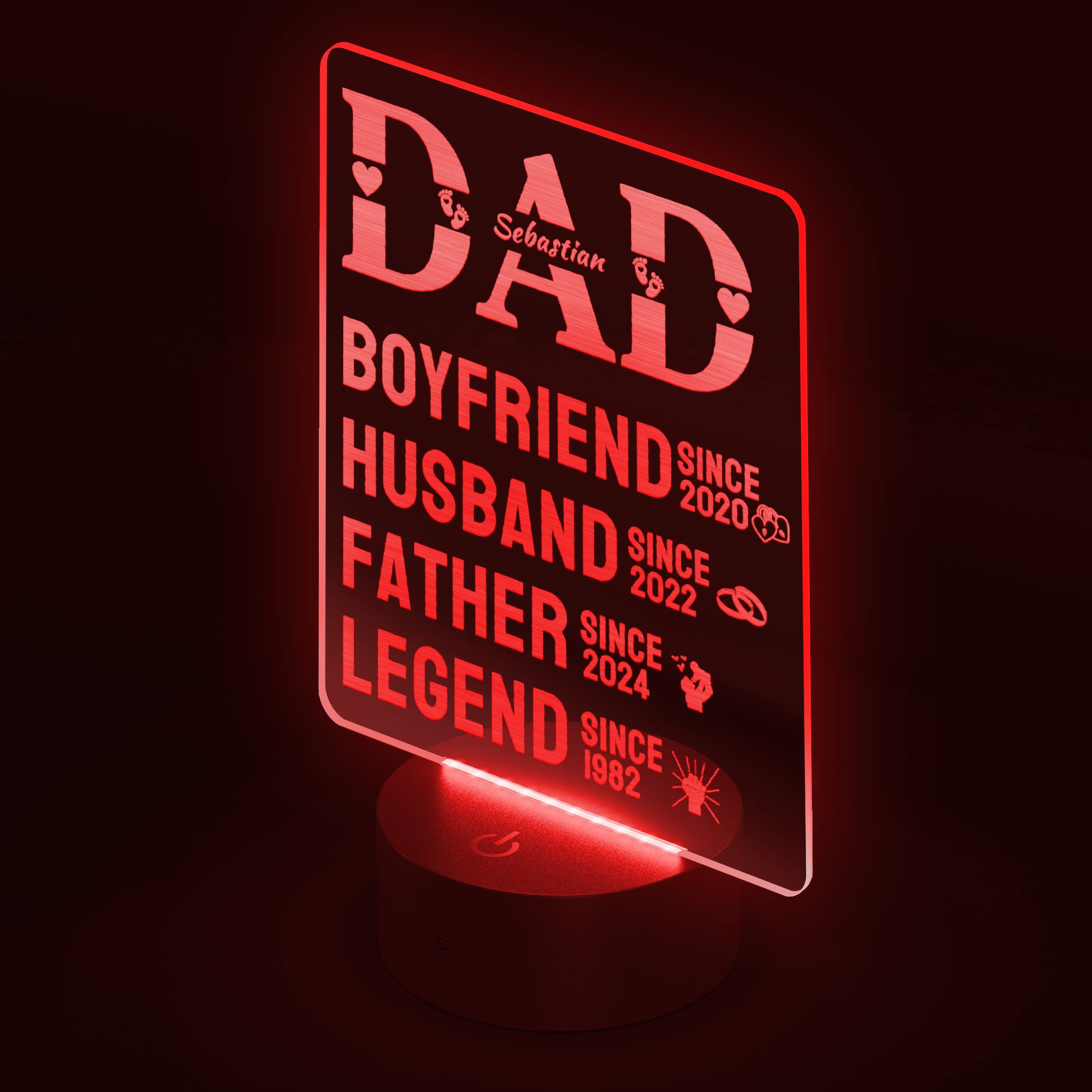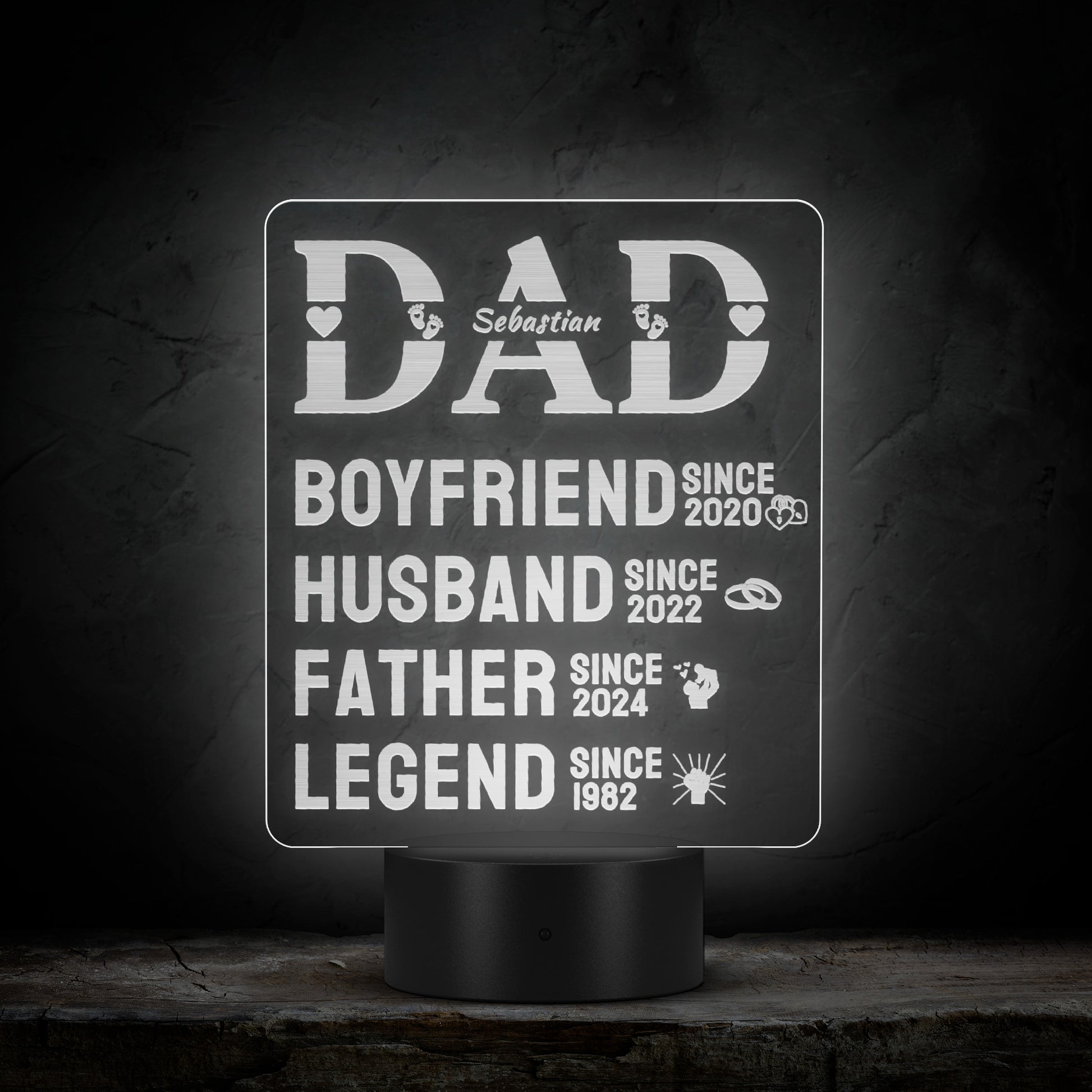 This personalized LED acrylic sign is more than just a decorative piece—it's a heartfelt expression of the love and pride that comes with fatherhood. The sign prominently features his most important title of "DAD" at the top with the name of his firstborn. Listed below are all his major milestones -- BOYFRIEND, HUSBAND, FATHER and of course LEGEND, making it a touching and memorable gift.