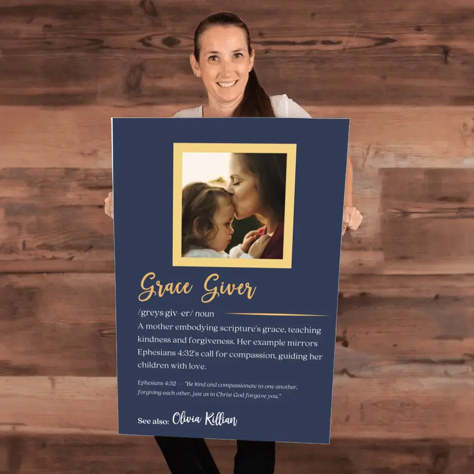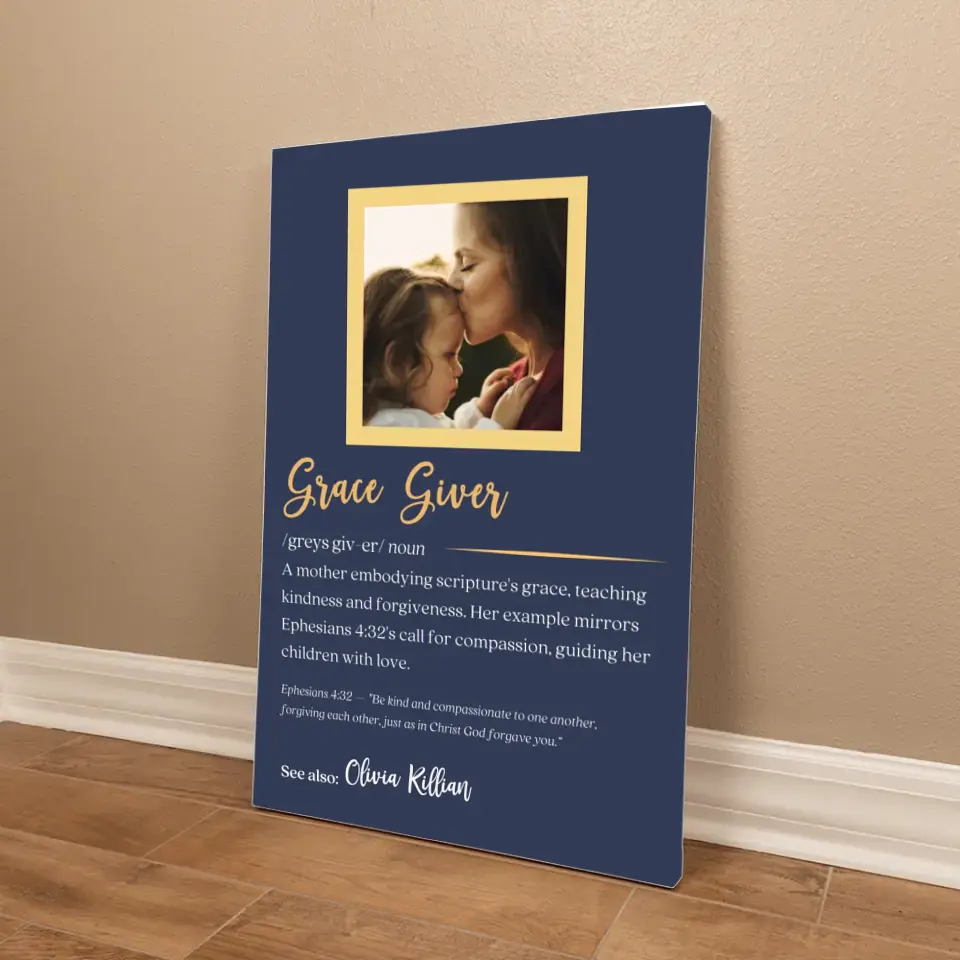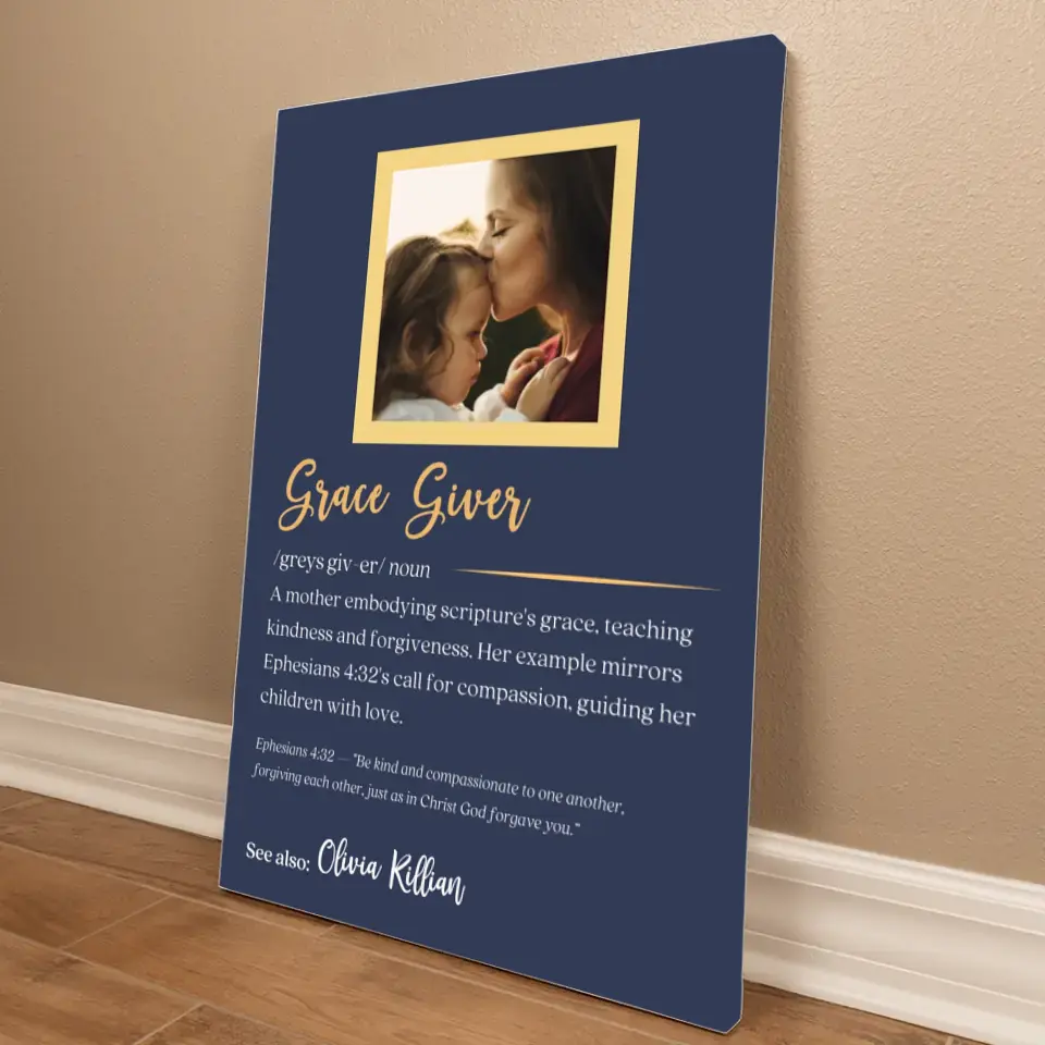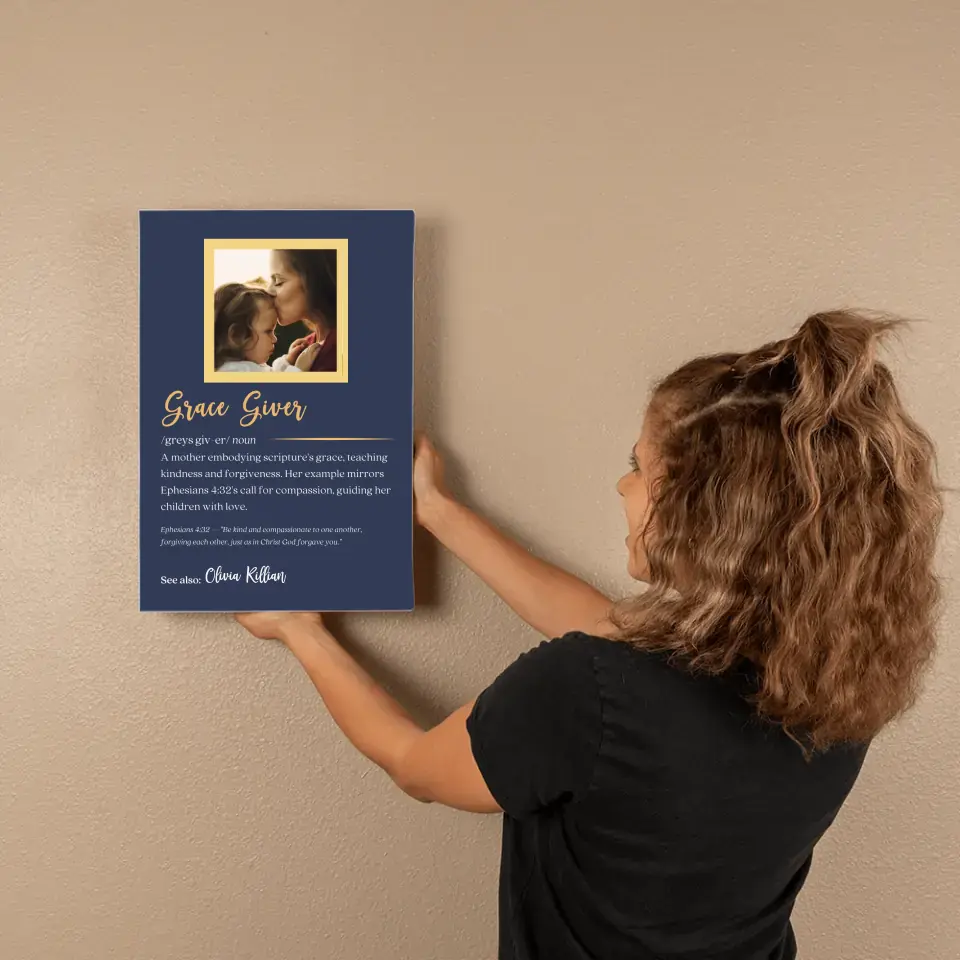 This Gallery Wrapped Canvas offers a personalized definition of a mother, capturing what she means to you. This addition transforms the canvas into a more meaningful tribute, celebrating the irreplaceable role of a mother in your life. Whether she's your Guiding Star, Soul Nurturer, Guardian of Dreams, Wisdom Whisperer, or Grace Giver, these gallery canvases are a modern tribute to her influence and love. Personalize it with her name and pick the definition that best describes her unique bond with you. It's not just a gift; it's a timeless piece of art that says, 'Your love has shaped me.