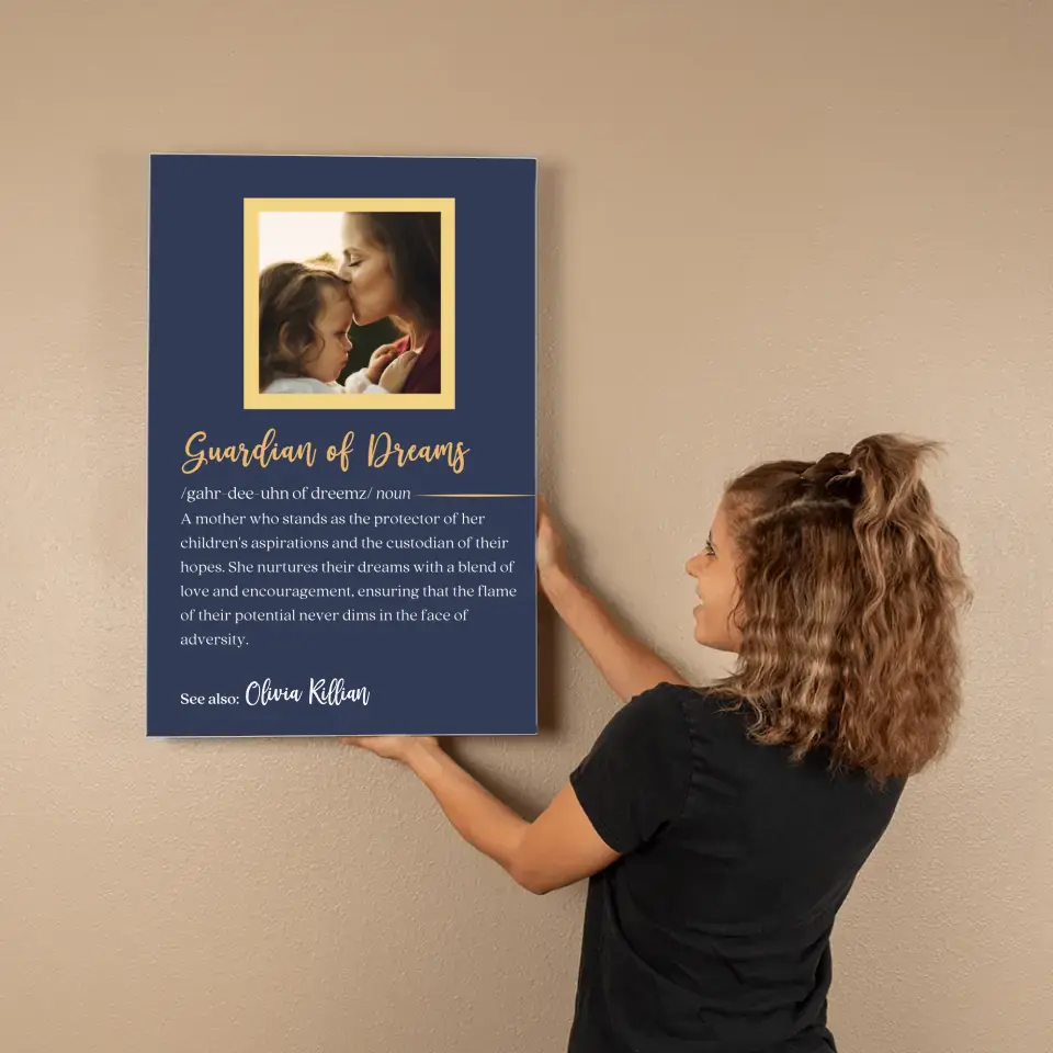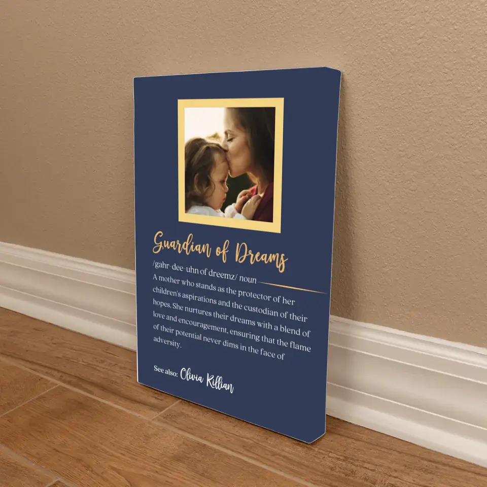 This Gallery Wrapped Canvas offers a personalized definition of a mother, capturing what she means to you. This addition transforms the canvas into a more meaningful tribute, celebrating the irreplaceable role of a mother in your life. Whether she's your Guiding Star, Soul Nurturer, Guardian of Dreams, Wisdom Whisperer, or Grace Giver, these gallery canvases are a modern tribute to her influence and love. Personalize it with her name and pick the definition that best describes her unique bond with you. It's not just a gift; it's a timeless piece of art that says, 'Your love has shaped me.
