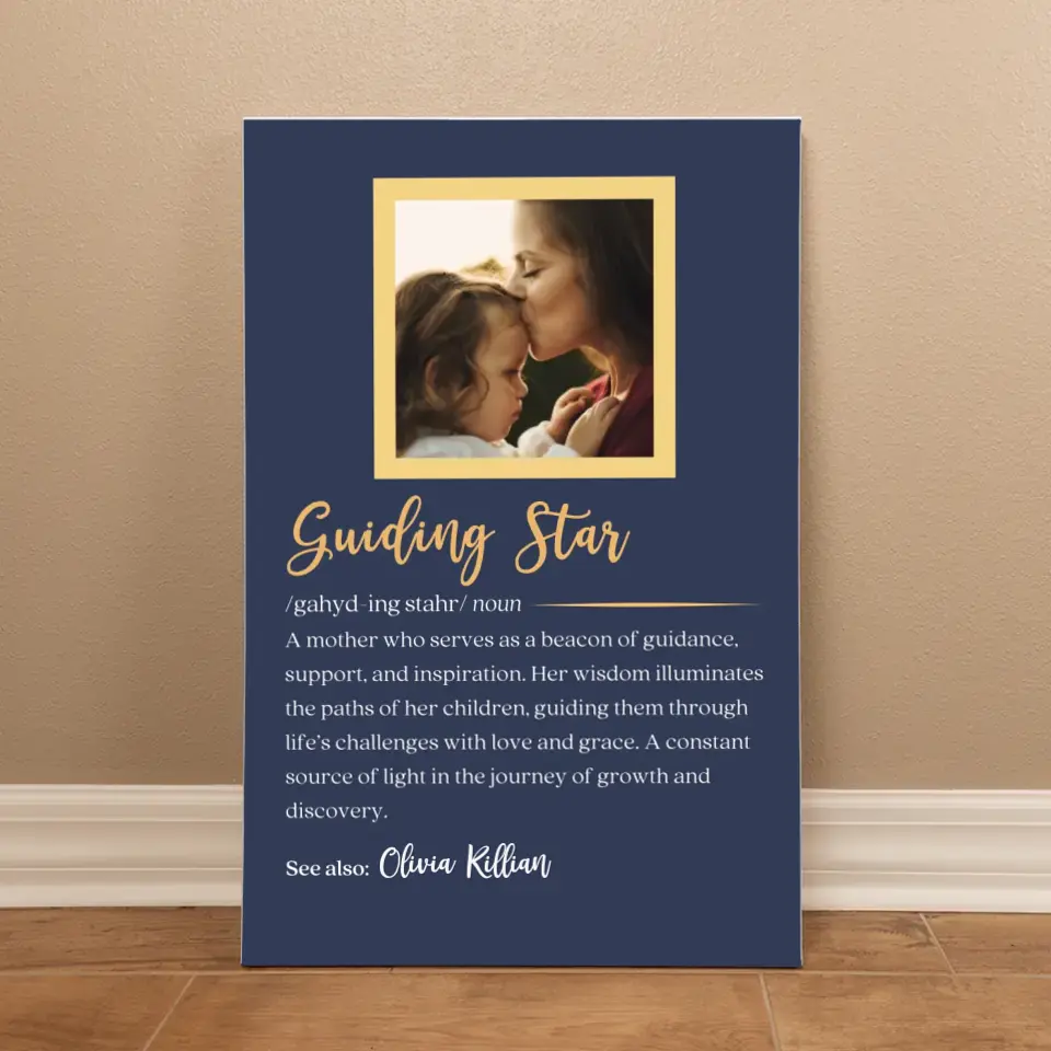 This Gallery Wrapped Canvas offers a personalized definition of a mother, capturing what she means to you. This addition transforms the canvas into a more meaningful tribute, celebrating the irreplaceable role of a mother in your life. Whether she's your Guiding Star, Soul Nurturer, Guardian of Dreams, Wisdom Whisperer, or Grace Giver, these gallery canvases are a modern tribute to her influence and love. Personalize it with her name and pick the definition that best describes her unique bond with you. It's not just a gift; it's a timeless piece of art that says, 'Your love has shaped me.
