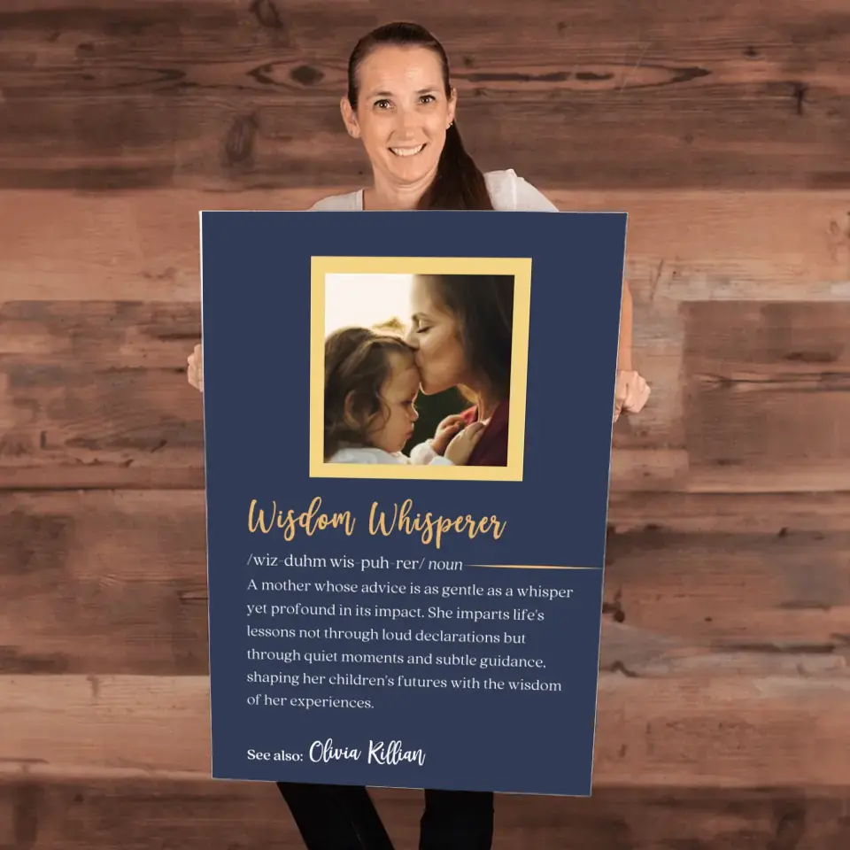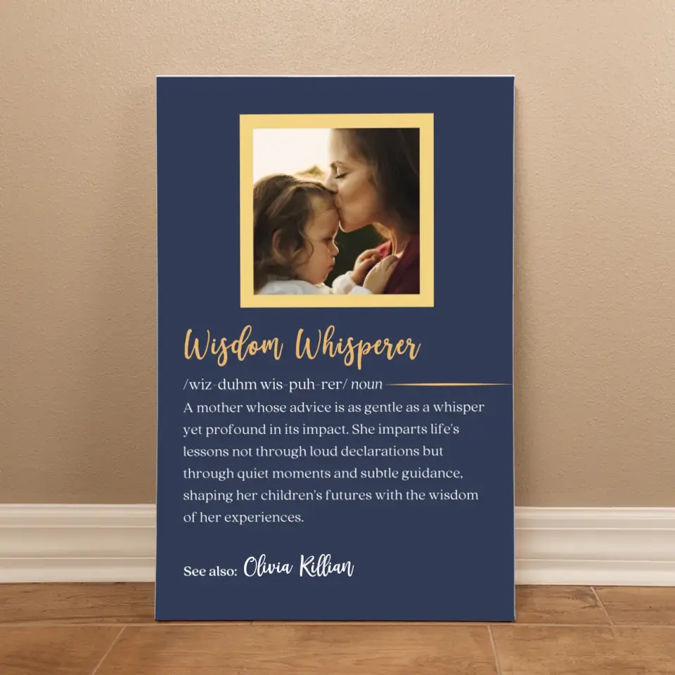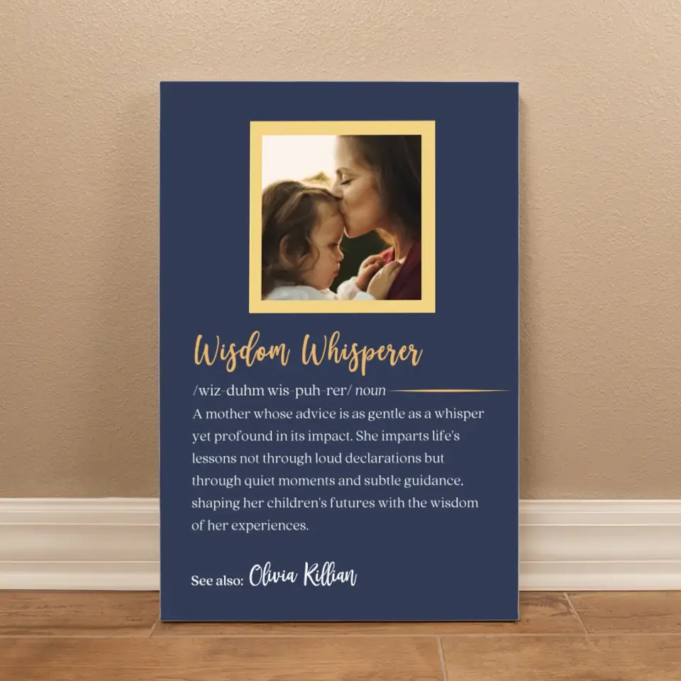 This Gallery Wrapped Canvas offers a personalized definition of a mother, capturing what she means to you. This addition transforms the canvas into a more meaningful tribute, celebrating the irreplaceable role of a mother in your life. Whether she's your Guiding Star, Soul Nurturer, Guardian of Dreams, Wisdom Whisperer, or Grace Giver, these gallery canvases are a modern tribute to her influence and love. Personalize it with her name and pick the definition that best describes her unique bond with you. It's not just a gift; it's a timeless piece of art that says, 'Your love has shaped me.