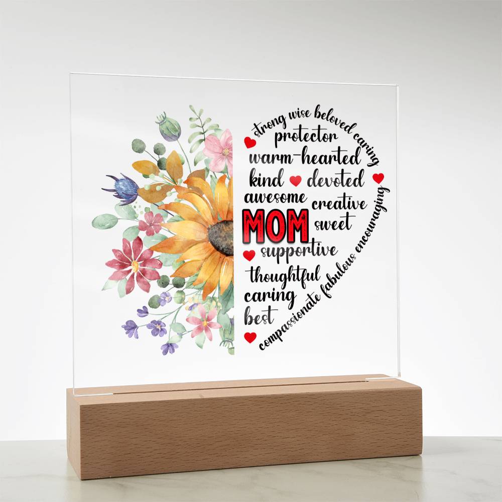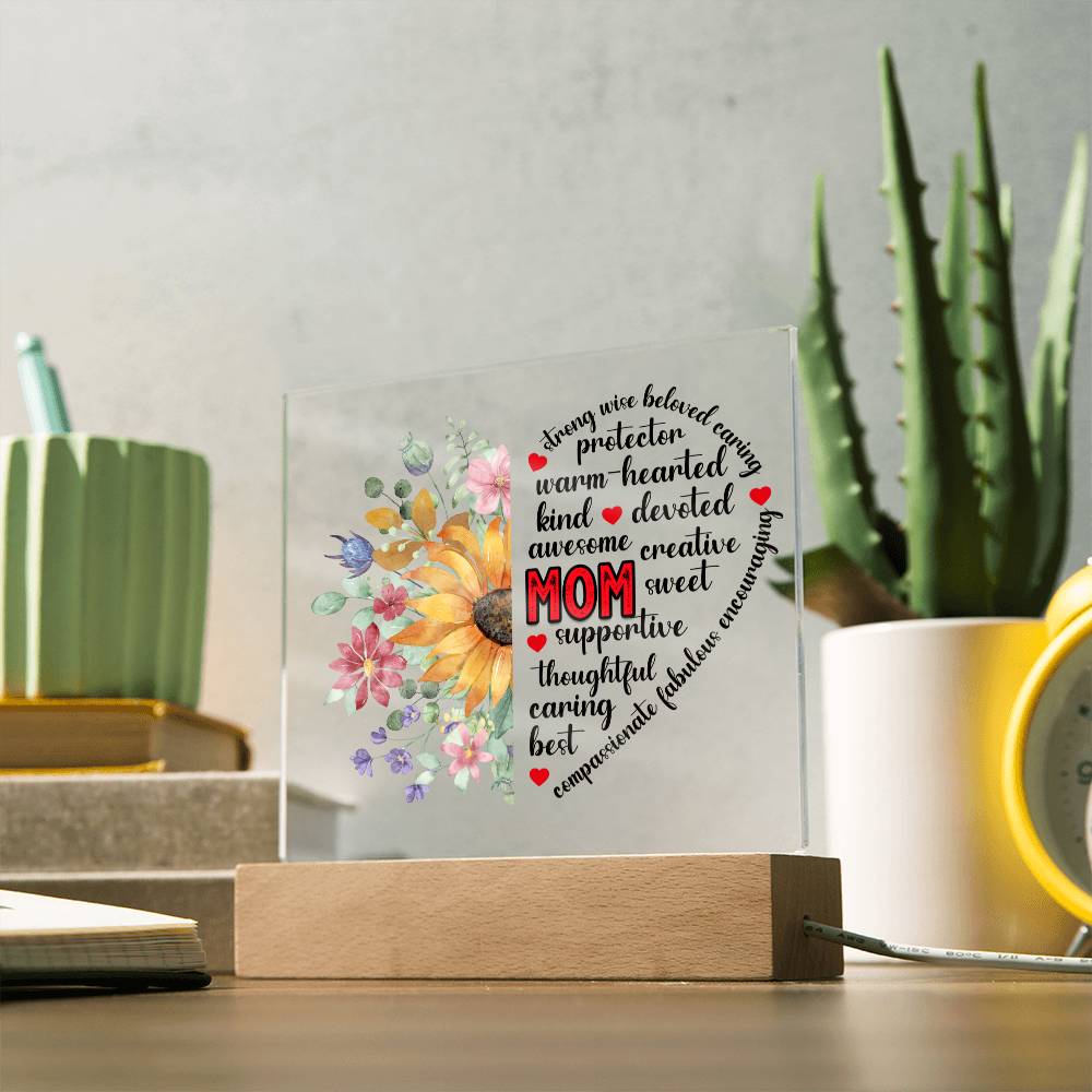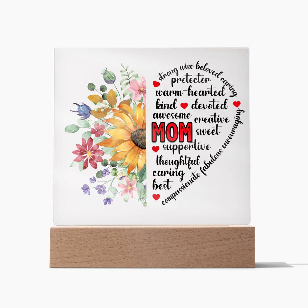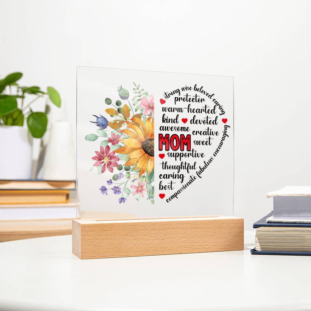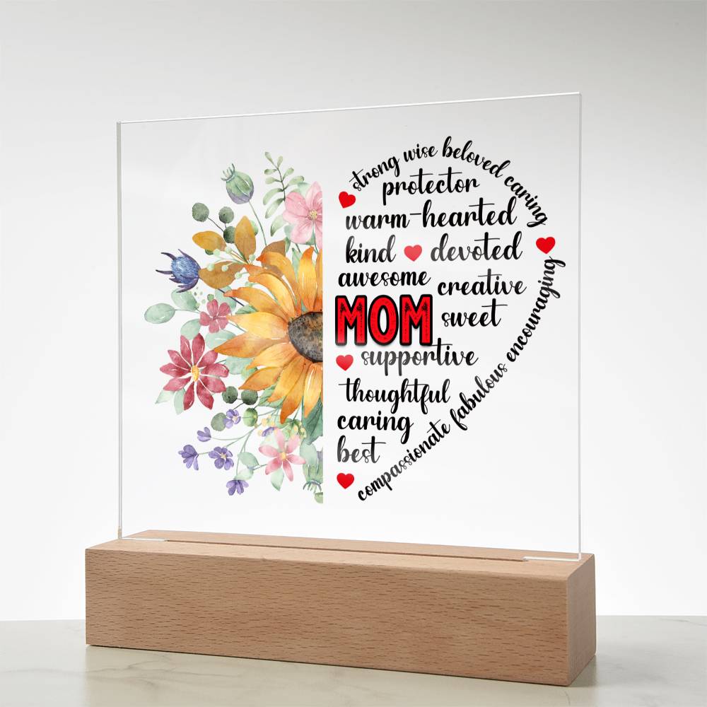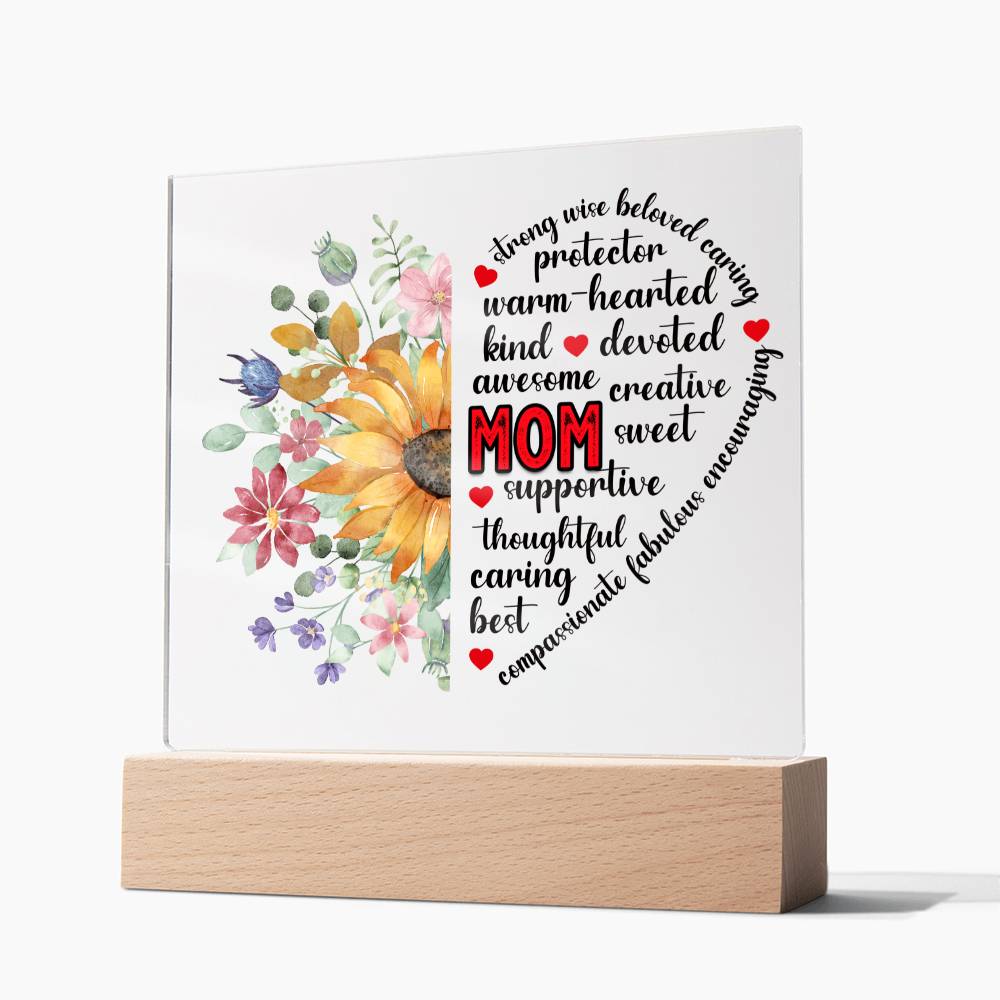 🌺 Handpicked Happiness for Her Heart! 🌺 Crafted with love, this plaque showcases a radiant sunflower arrangement, symbolizing your mom's vibrant spirit and unwavering care. Coupled with the tender inscription "MOM" in striking red, enveloped by adoring hearts and affirming adjectives, it whispers a thousand words of gratitude and adoration.