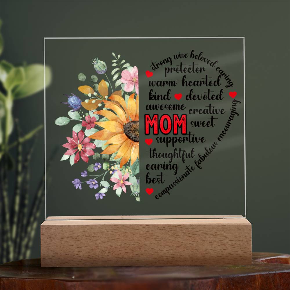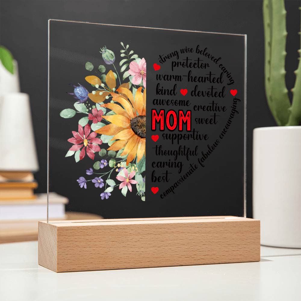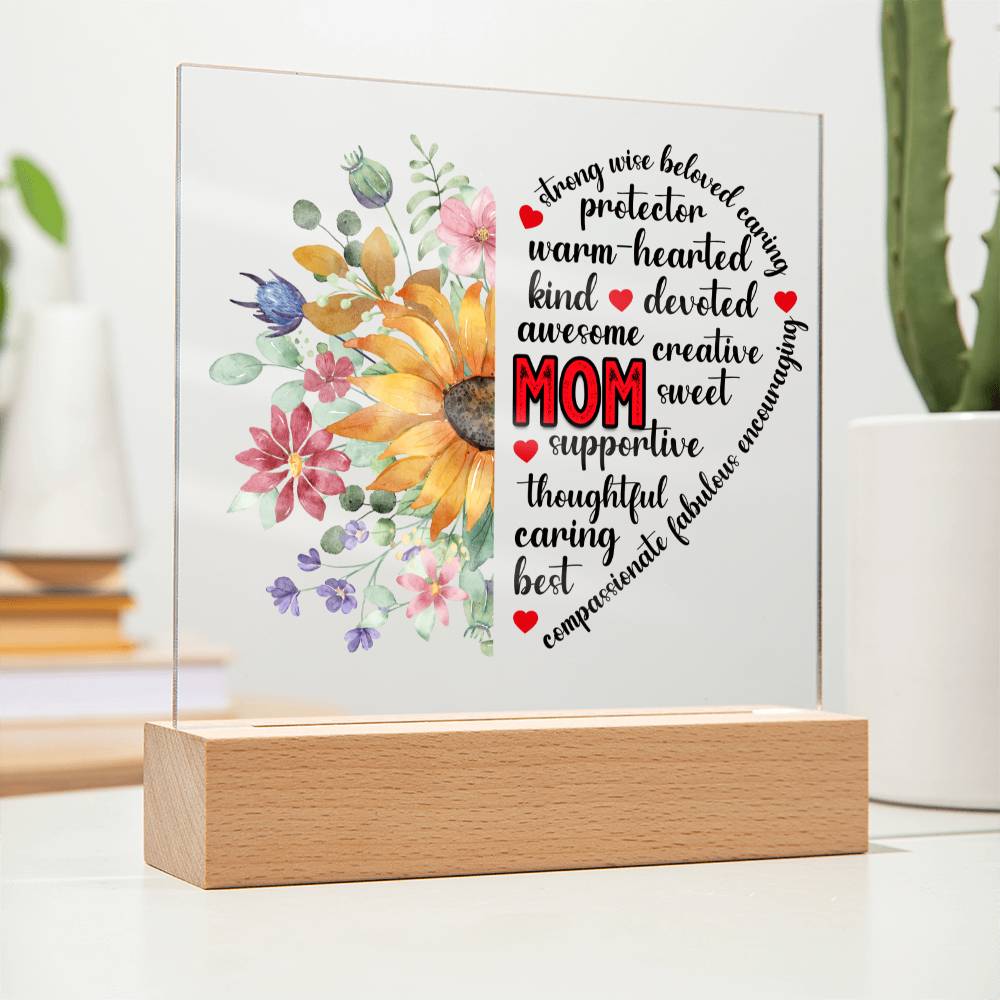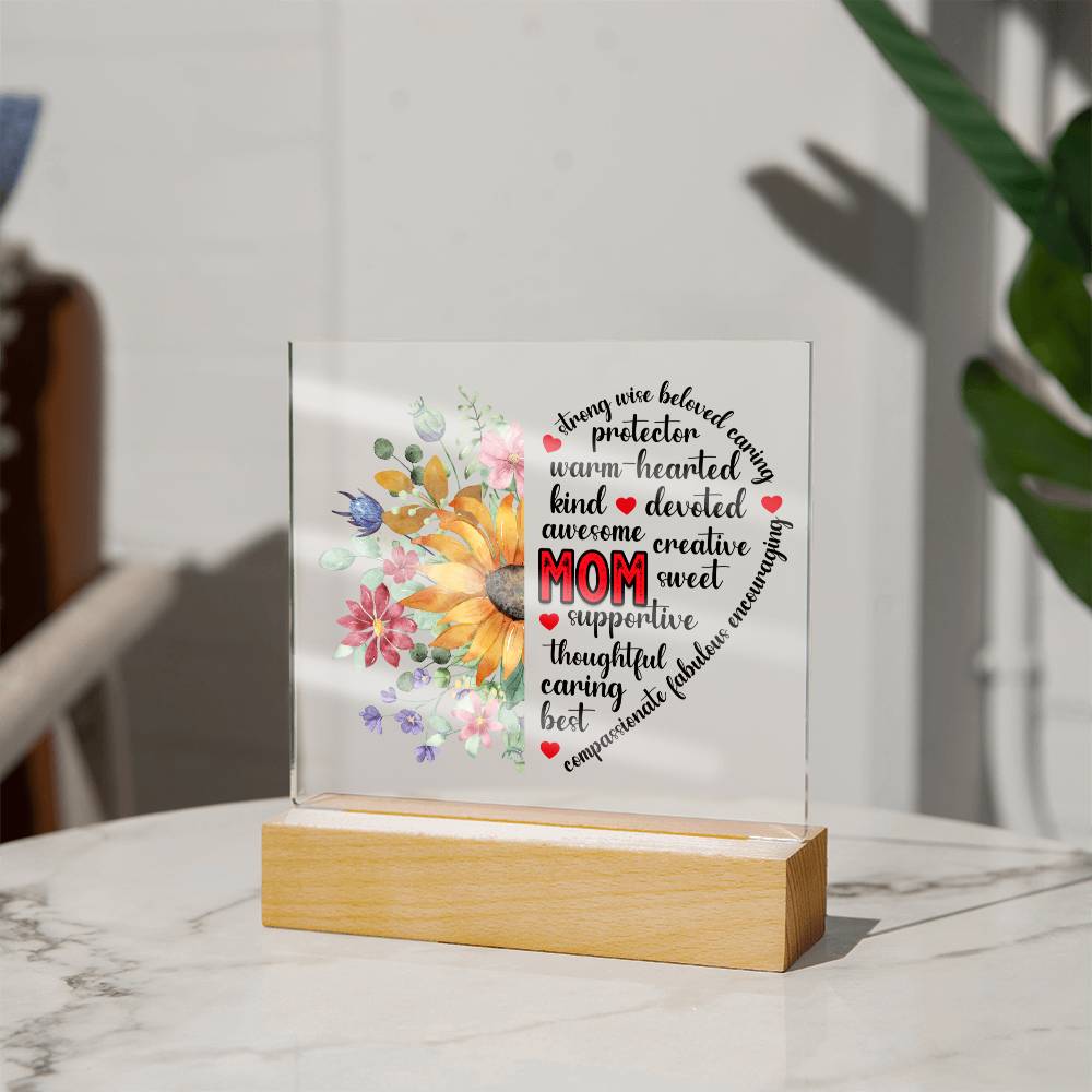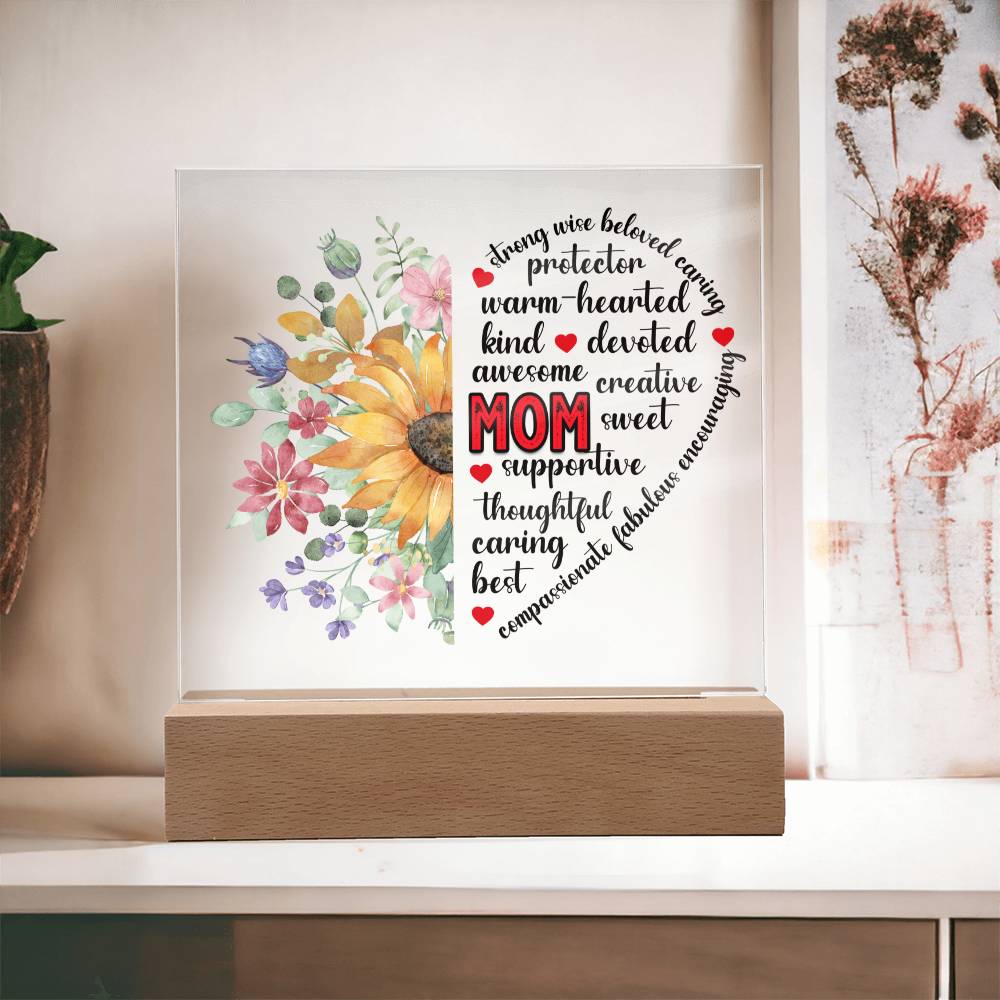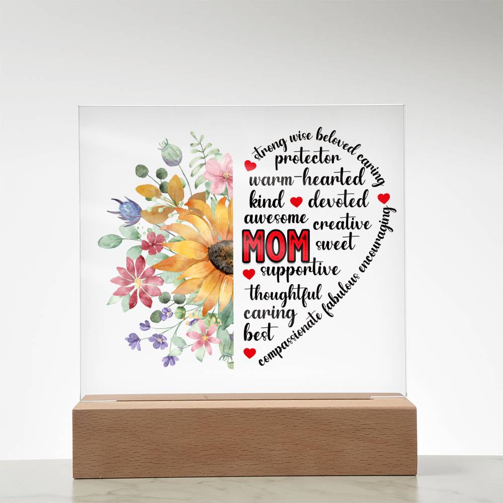 🌺 Handpicked Happiness for Her Heart! 🌺 Crafted with love, this plaque showcases a radiant sunflower arrangement, symbolizing your mom's vibrant spirit and unwavering care. Coupled with the tender inscription "MOM" in striking red, enveloped by adoring hearts and affirming adjectives, it whispers a thousand words of gratitude and adoration.
