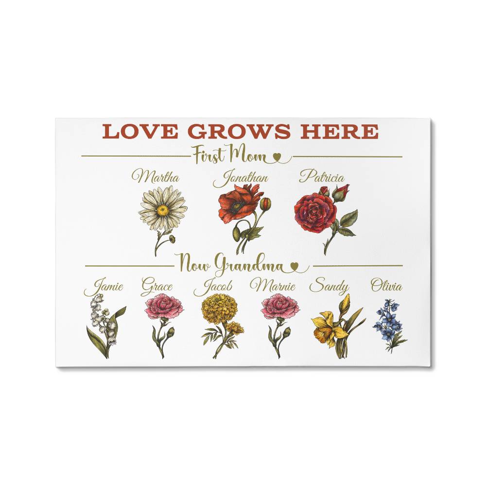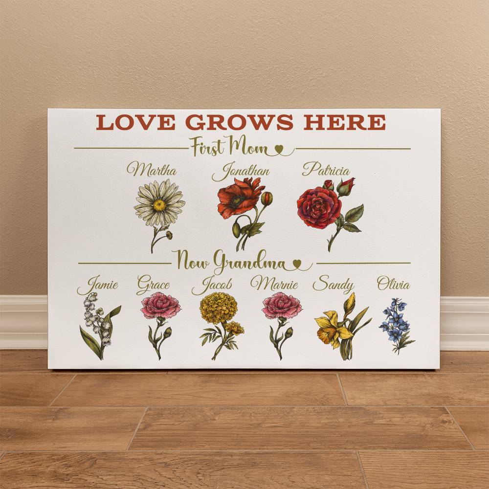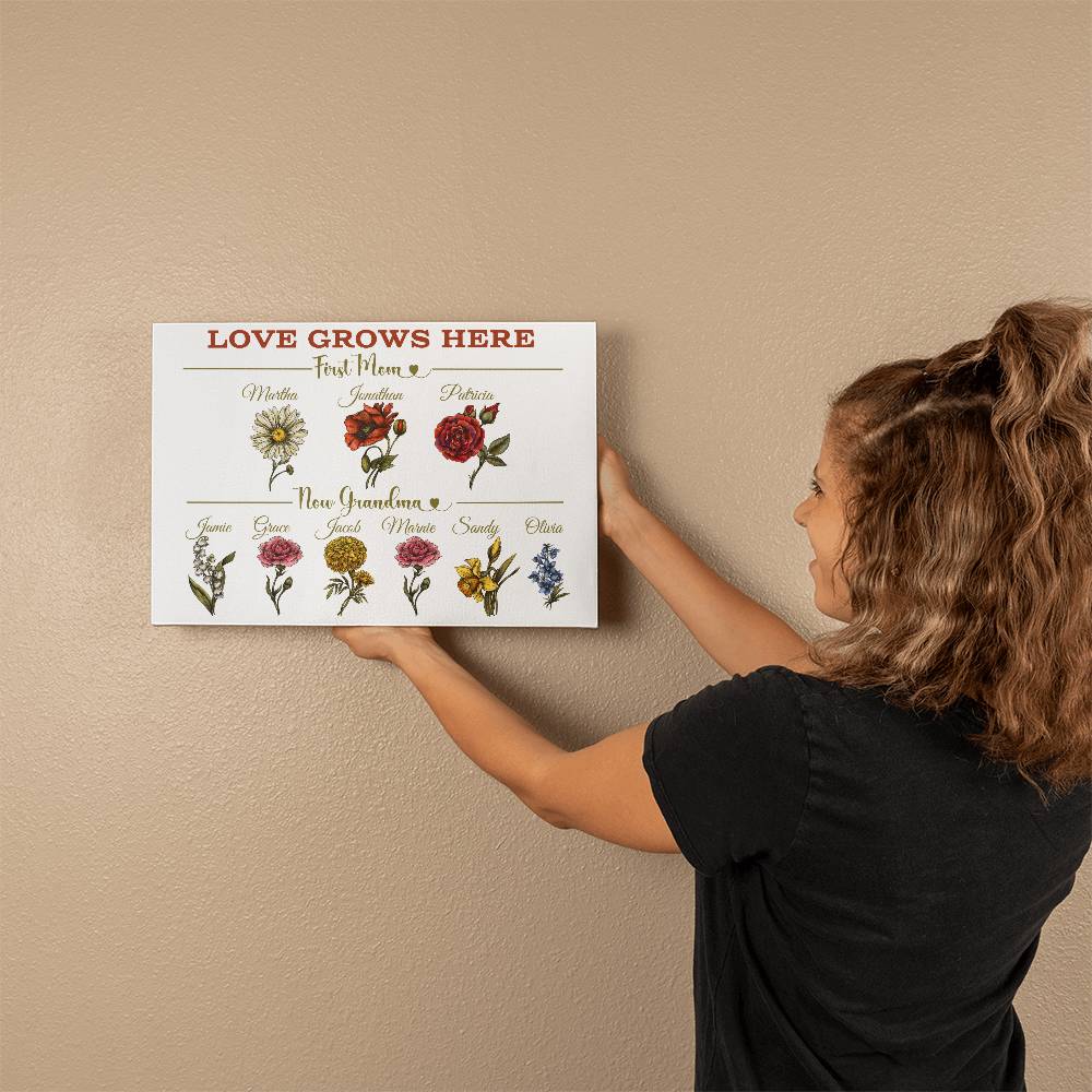 Bring warmth and love into your space with our "Love Grows Here" Gallery Wrapped Canvas. This exceptional piece of art is not just a decoration but a heartfelt celebration of family evolution from being a First Mom to embracing the joyous role of Now Grandma. Each section thoughtfully incorporates up to 6 birth month flowers, representing each child and grandchild, making it a deeply personal and cherished display.